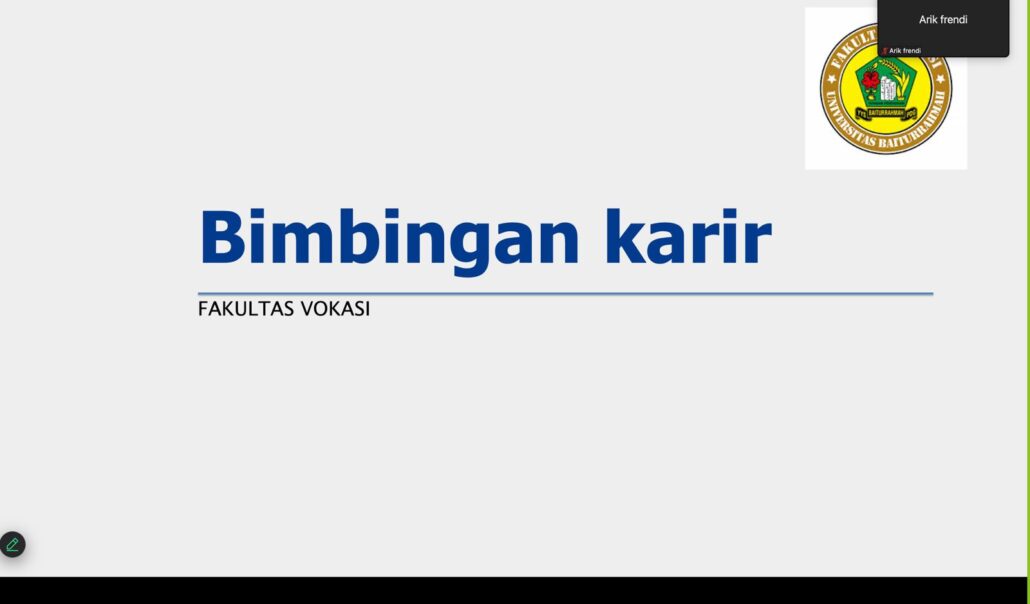 Fakultas Vokasi menyelenggarakan kegiatan Bimbingan Karier bagi Calon Wisudawan pada Senin, 21 Desember 2025. Kegiatan ini diikuti oleh mahasiswa calon wisudawan di lingkungan Fakultas Vokasi dan dilaksanakan secara daring melalui Zoom Meeting mulai pukul 20.00 WIB – selesai.